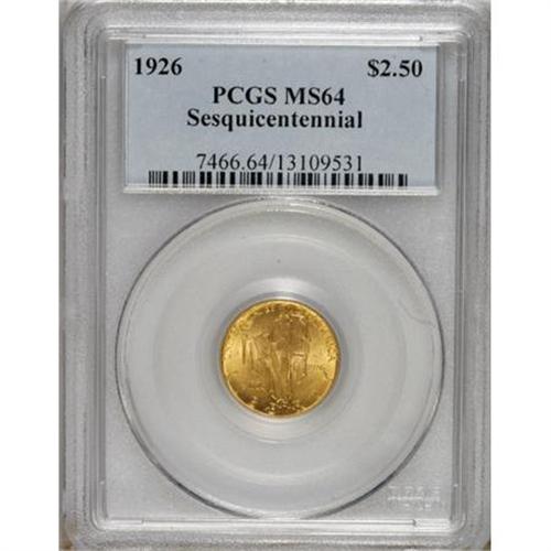 <B>1926 $2 1/2 Sesquicentennial MS64 PCGS.</B></I> This highly lustrous example displays shimmering luster and essentially untoned surfaces. A tiny mark is noted on Liberty's chin. Struck to commemorate the 150th anniversary of the United States. <BR><BR><b>Shipping:</b> Coins & Currency (<a target="_blank" href="http://www.heritageauctions.com/common/shipping.php">view shipping information</a>)