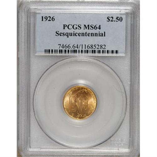 <B>1926 $2 1/2 Sesquicentennial MS64 PCGS.</B></I> The lustrous copper-gold surfaces are graced with hints of hazel-gray near the peripheries. Despite excellent eye appeal, this well struck example shows a few too many marks to reach the elusive Gem status.<BR><BR><b>Shipping:</b> Coins & Currency (<a target="_blank" href="http://www.heritageauctions.com/common/shipping.php">view shipping information</a>)