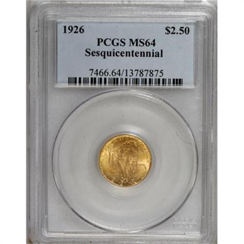 <B>1926 $2 1/2 Sesquicentennial MS64 PCGS.</B></I> The pale straw-gold surfaces of this pretty Choice Sesquicentennial quarter eagle offer pleasing luster and a handful of faint abrasions. A well struck representative of above-average quality for the grade assigned.<BR><BR><b>Shipping:</b> Coins & Currency (<a target="_blank" href="http://www.heritageauctions.com/common/shipping.php">view shipping information</a>)