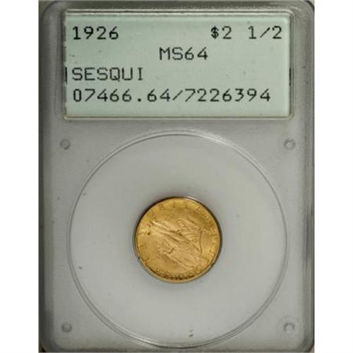 <B>1926 $2 1/2 Sesquicentennial MS64 PCGS.</B></I> Both sides of this near-Gem Sequin commemorative are awash in dazzling luster. Well preserved yellow-gold surfaces exhibit sharply struck design elements. Housed in a first generation PCGS holder.<BR><BR><b>Shipping:</b> Coins & Currency (<a target="_blank" href="http://www.heritageauctions.com/common/shipping.php">view shipping information</a>)
