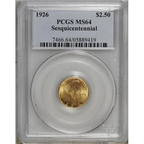 <B>1926 $2 1/2 Sesquicentennial MS64 PCGS.</B></I> This strongly lustrous Sesquicentennial quarter eagle has a lemon-gold obverse with bolder yellow-gold shadings on the reverse. Well-defined with just a few too many small flaws to achieve Gem status.<BR><BR><b>Shipping:</b> Coins & Currency (<a target="_blank" href="http://www.heritageauctions.com/common/shipping.php">view shipping information</a>)