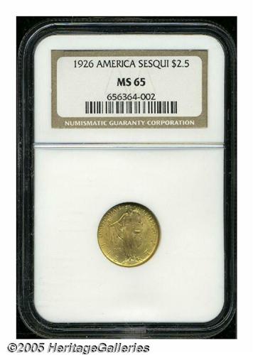 <B>1926<$2 1/2> Sesquicentennial MS65 NGC.</B></I> Bright and lustrous for this issue, with far better than average surfaces. A few more Gems have been graded in recent years and this one should suit most collectors. No signs of toning aside from a couple of small reverse copper specks.