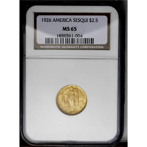 <B>1926<$2 1/2> Sesquicentennial MS65 NGC.</B></I> Lustrous and well struck throughout with bright golden luster. A few small abrasions on the obverse serve to limit the grade. A popular issue that is highly collectible.