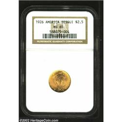 1926 $2 1/2 Sesquicentennial MS65 NGC. Smooth with fulsome mint frost and original orange and golden-rose coloration, this coin would do wonders for an advanced Commemorative gold collection. The present sale notwithstanding, the 1926 Sesquicentennial Quarter Eagle is a conditionally challenging issue that is typically offered in grades no finer than MS64. Important notice: We expect to be auctioning lots at the rate of 200-250 per hour. Sometimes eBay Premier live bid software cannot keep up with that pace, so we strongly recommend that you place a realistic proxy bid now as insurance to avoid disappointment. Also please note that all Heritage/CAA lots purchased through eBay Premier carry a 20% Buyer's Premium. Please make sure you read the Terms and Conditions.