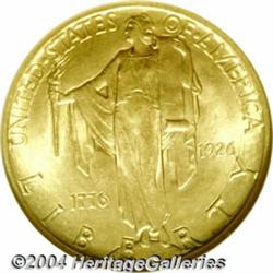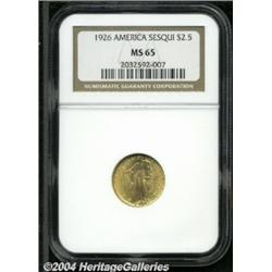 <B>1926<$2 1/2> Sesquicentennial MS65 NGC.</B></I> Well struck with frosty green-gold luster. A conspicuous absence of most marks befits the Gem, MS65 assigned grade. A beautiful Gem representative of this popular commemorative Quarter Eagle. <BR><BR><B>Important notice:</B> Heritage usually auctions material at the rate of 200-250 lots per hour. On some occasions eBay Live bid software or the Internet may not be able to keep up with the pace of the auction. We recommend placing a realistic absentee bid now as insurance to avoid disappointment. Occasionally the auctioneer may eliminate or reject an eBay Live bid, and the auctioneer may also reopen a lot after the close of the eBay live bidding (usually because we missed an audience bid), and may reject your bid even if it shows you as the winning bidder. By bidding via eBay Live, you agree that Heritage may award the lot to another bidder at its sole discretion under the circumstances described above or any other reasonable circumstances. Since eBay bids are not shown to us until we open the lot on the floor, we treat those bids just like floor bids. In most cases the floor responds before the eBay bid is presented to us, due to Internet lag time, so for consistency we have made it a policy that floor bids are always considered first over tie eBay live bids. Also please note that all Heritage lots purchased through eBay Live carry a 20% Buyer's Premium. Please make sure you read the Terms and Conditions before you bid. </span></font></tr></table></td></tr></table>