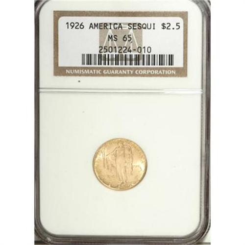 <B>1926 $2 1/2 Sesquicentennial MS65 NGC.</B></I> Crisply struck with far more radiance and appeal than is generally seen on this significant gold commemorative. One has to look closely to locate a cluster of tiny luster grazes on Liberty's knee, the only appreciable grade limitation on this attractive, extremely lustrous Gem example.<BR><BR><b>Shipping:</b> Coins & Currency (<a target="_blank" href="http://www.heritageauctions.com/common/shipping.php">view shipping information</a>)
