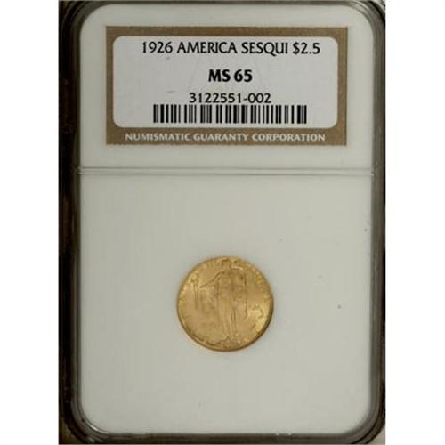 <B>1926 $2 1/2 Sesquicentennial MS65 NGC.</B></I> Dazzling luster exudes from both sides of this Gem Sesqui commemorative quarter eagle. Yellow-gold surfaces display hints of light green, and a couple of light copper spots on the reverse. The design elements are well brought up throughout. A minute mark or two on each side likely precludes an even higher grade.<BR><BR><b>Shipping:</b> Coins & Currency (<a target="_blank" href="http://www.heritageauctions.com/common/shipping.php">view shipping information</a>)