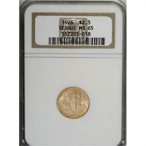 <B>1926 $2 1/2 Sesquicentennial MS65 NGC.</B></I> In 1926, the Philadelphia Mint coined 46,019 Sesquicentennial quarter eagles , the odd pieces being reserved for Assay. This frosty Gem has brilliant yellow-gold luster, with exceptional surfaces, and sharp design elements. NGC has only certified 89 finer examples of this quarter eagle variety.<BR><I>From The Southwest Collection.</B></I><BR><BR><b>Shipping:</b> Coins & Currency (<a target="_blank" href="http://www.heritageauctions.com/common/shipping.php">view shipping information</a>)