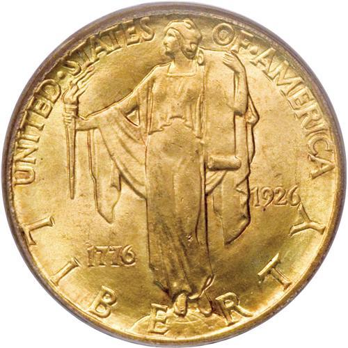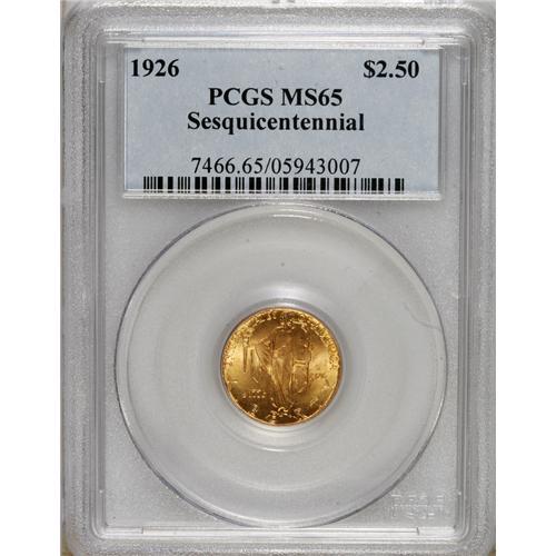 <B>1926 $2 1/2 Sesquicentennial MS65 PCGS.</B></I> A frosty yellow-orange representative that displays glints of lighter color in the fields. Sharply defined with only a few trivial marks evident on each side. This issue is perhaps the most famous condition rarity of the classic commemorative gold issues, even with heavy competition for the title from a number of designs.<BR><BR><b>Shipping:</b> Coins & Currency (<a target="_blank" href="http://www.heritageauctions.com/common/shipping.php">view shipping information</a>)