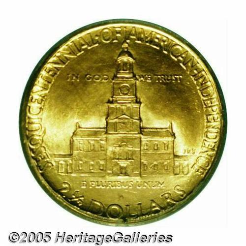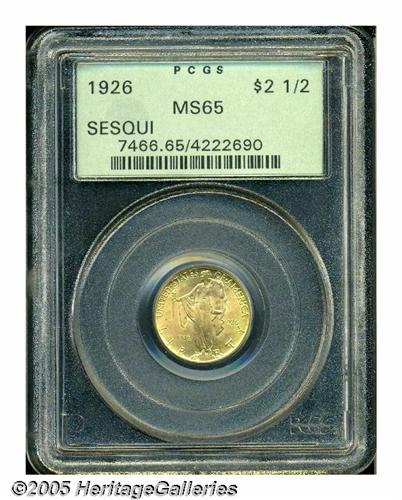<B>1926<$2 1/2> Sesquicentennial MS65 PCGS.</B></I> A lustrous Gem with honey-gold surfaces and only minor abrasions. Well struck for the issue, with nice overall eye appeal. From an original mintage of 46,019 pieces, most extant examples are in low Mint State grades. Gem specimens command substantial premiums for their relative scarcity.