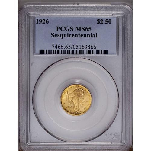 <B>1926 $2 1/2 Sesquicentennial MS65 PCGS.</B></I> A sharply struck and lustrous near-Gem that has rich honey-gold color and attractive surfaces. A few small marks are noted on Liberty's thigh and knee that limit the already high grade. The Sesquicentennial was the final gold commemorative type prior to the 1984 Los Angeles Olympics.<BR><BR><b>Shipping:</b> Coin/Currency (<a target="_blank" href="http://www.heritageauctions.com/common/shipping.php">view shipping information</a>)