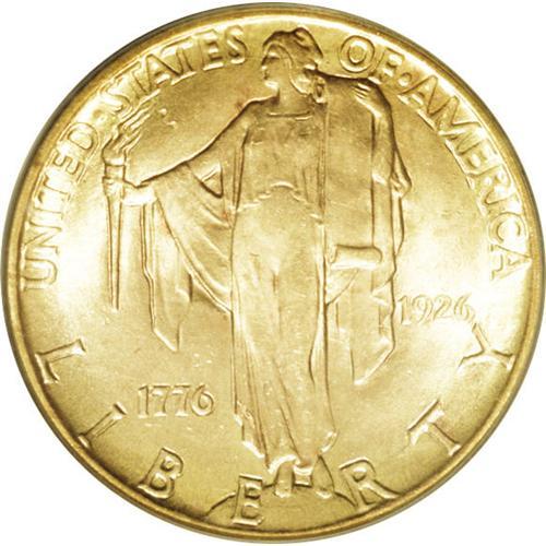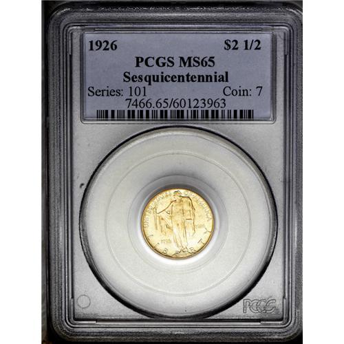 <B>1926<$2 1/2> Sesquicentennial MS65 PCGS.</B></I> Appealing lemon-yellow and lilac highlights demonstrate the originality of this shimmering, well preserved Gem. Two small milling marks to the right of the torch's flame are really minor in the overall scheme of things, but can be used for future identification. <BR><BR><B>Important notice:</B> Heritage usually auctions material at the rate of 200-250 lots per hour. On some occasions eBay Live bid software or the Internet may not be able to keep up with the pace of the auction. We recommend placing a realistic absentee bid now as insurance to avoid disappointment. Occasionally the auctioneer may eliminate or reject an eBay Live bid, and the auctioneer may also reopen a lot after the close of the eBay live bidding (usually because we missed an audience bid), and may reject your bid even if it shows you as the winning bidder. By bidding via eBay Live, you agree that Heritage may award the lot to another bidder at its sole discretion under the circumstances described above or any other reasonable circumstances. Since eBay bids are not shown to us until we open the lot on the floor, we treat those bids just like floor bids. In most cases the floor responds before the eBay bid is presented to us, due to Internet lag time, so for consistency we have made it a policy that floor bids are always considered first over tie eBay live bids. Also please note that all Heritage lots purchased through eBay Live carry a 20% Buyer's Premium. Please make sure you read the Terms and Conditions before you bid. This lot is being auctioned in conjunction with a live floor auction by Heritage Galleries & Auctioneers. All final auction and invoice information will be supplied by Heritage Galleries & Auctioneers, and all other information should be considered preliminary. Lot:5196 <BR><BR><B>Winning Notification and Billing:</B> After the FINAL session in this auction is complete, Heritage will send e-mail and snail mail invoices. This process normally takes several days. All final auction and invoice information will be supplied by Heritage Galleries & Auctioneers, and all other information should be considered preliminary. <BR><BR>This auction will be conducted on a live auction floor and over the Internet through eBay Live. If you choose to place an absentee bid, please take a moment to <font color='#0000ff'><u><a href='http://pages.ebay.com/liveauctions/help/before/laabsentee.html'>learn how eBay Live absentee bidding works</a></u></font><font color='#000000'>