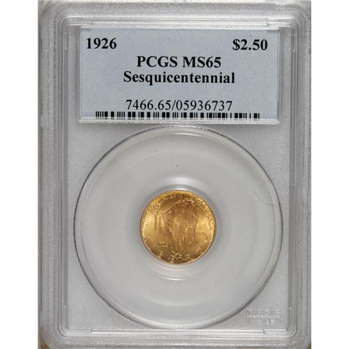<B>1926 $2 1/2 Sesquicentennial MS65 PCGS.</B></I> Because of the low-relief design, examples of this issue that are well struck up can be elusive. This is one such piece, however, with good articulation on Liberty's face and hands, and the facade of the building on the reverse. Booming luster complements the pleasing orange-gold coloration. An elusive issue at the next grade level.<BR><BR><b>Shipping:</b> Coins & Currency (<a target="_blank" href="http://www.heritageauctions.com/common/shipping.php">view shipping information</a>)