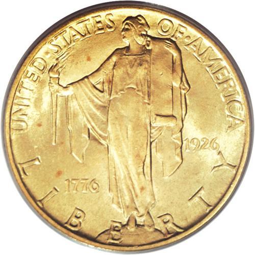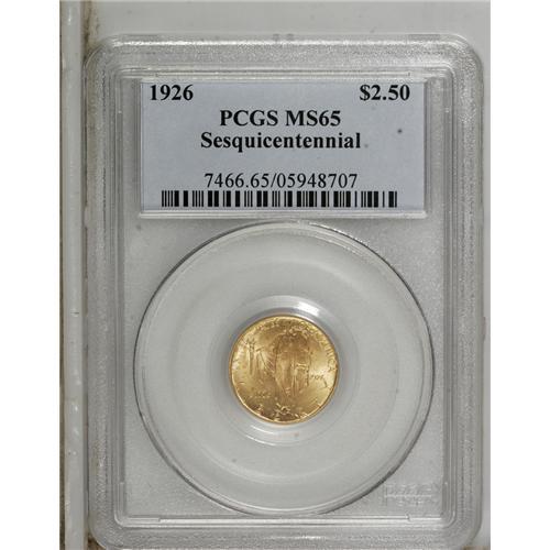 <B>1926 $2 1/2 Sesquicentennial MS65 PCGS.</B></I> Both sides of this Sesqui two and one-half dollar are awash in luster, with each presenting peach-gold color and hints of light green. The design elements are well impressed, with no areas displaying hints of weakness. A few minute obverse marks are within the confines of the MS65 grade designation. A faint die crack passes through Liberty's head.<BR><BR><b>Shipping:</b> Coins & Currency (<a target="_blank" href="http://www.heritageauctions.com/common/shipping.php">view shipping information</a>)