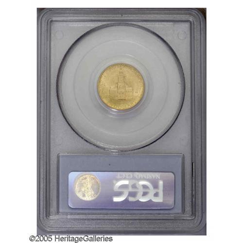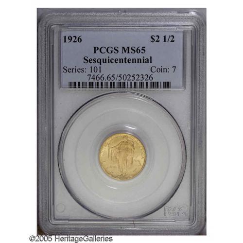 <B>1926<$2 1/2> Sesquicentennial MS65 PCGS.</B></I> Dazzling cartwheel luster illuminates this well struck piece, which possesses a clean reverse and no substantial obverse marks. Struck in unusually low relief for a commemorative type of the era, the Sesquicentennial nonetheless generated the highest sales of any gold commemorative issue prior to 1984, probably due to the significance of its theme.