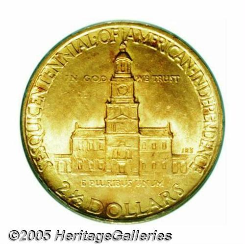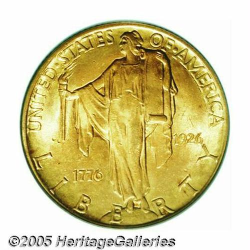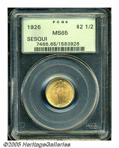 <B>1926<$2 1/2> Sesquicentennial MS65 PCGS.</B></I> It is always an occasion of pride for us when a solidly graded Gem 1926 Sesquicentennial Quarter Eagle appears in one of our Signature Sales. After all, the vast majority of extant Sesqui Two-and-a-Halves have been certified at or below the MS64 level. Pleasingly frosted with rich, original, rose-gold color, both sides are virtually free of distracting abrasions. Blushes of pale, lime-green iridescence are seen around the peripheries as the coin rotates under the light. A couple of grazes are visible on the left reverse field and several copper colored alloy spots are also on that side.