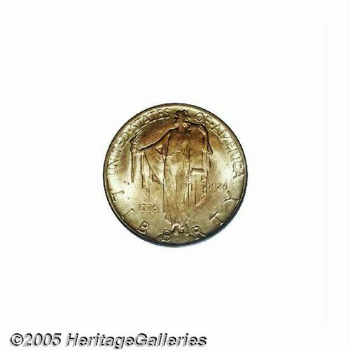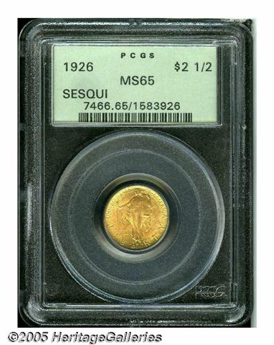 <B>1926<$2 1/2> Sesquicentennial MS65 PCGS.</B></I> It is always an occasion of pride for us when a solidly graded Gem 1926 Sesquicentennial Quarter Eagle appears in one of our Signature Sales. After all, the vast majority of extant Sesqui Two-and-a-Halves have been certified at or below the MS64 level. Pleasingly frosted with rich, original, rose-gold color, both sides are virtually free of distracting abrasions. Blushes of pale, lime-green iridescence are seen around the peripheries as the coin rotates under the light. A couple of grazes are visible on the left reverse field and several copper-colored alloy spots are visible on each side.