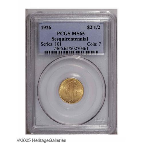 <B>1926<$2 1/2> Sesquicentennial MS65 PCGS.</B></I> Pleasing honey-gold highlights are seen on this popular gold commemorative coin. A few marks on the reverse keep it from an even higher grade.