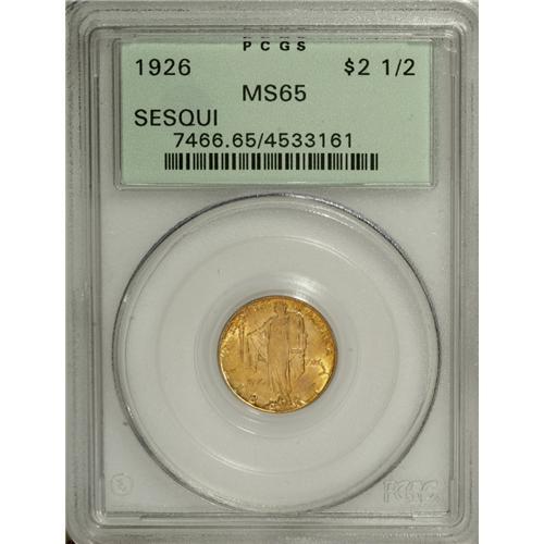<B>1926 $2 1/2 Sesquicentennial MS65 PCGS.</B></I> Radiant luster is the hallmark of this lovely Sesquicentennial quarter eagle, and a closer look with a loupe confirms the relative absence of contact, the bold strike over deep apricot-gold surfaces, and a premium appearance. An uncommonly nice, high-end Gem of this popular gold commemorative, certified in a green label holder.<BR><BR><b>Shipping:</b> Coins & Currency (<a target="_blank" href="http://www.heritageauctions.com/common/shipping.php">view shipping information</a>)