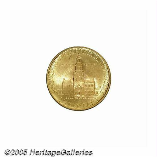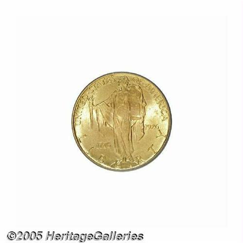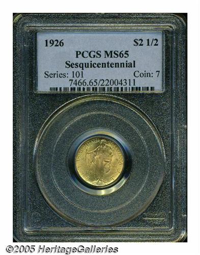 <B>1926<$2 1/2> Sesquicentennial MS65 PCGS.</B></I> Sparkling and very bright for this scarce issue. The surfaces really set this one apart, as few were sold to collectors, and most show moderate handling nicks. Not so here, as the present coin is a full, undeniable Gem. One tiny reeding mark is located in the right reverse field just off from the building's roof.