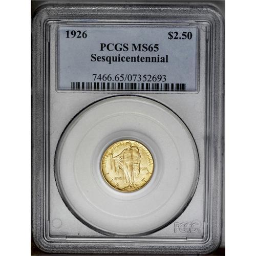 <B>1926<$2 1/2> Sesquicentennial MS65 PCGS.</B></I> While near-Gem Sesquicentennial quarter eagles abound in today's market, lucky indeed is the collector who manages to locate an accurately graded Gem. This lovely coin is free of both bothersome abrasions and unsightly toning spots. Bright yellow-golden luster overall.