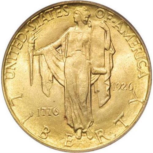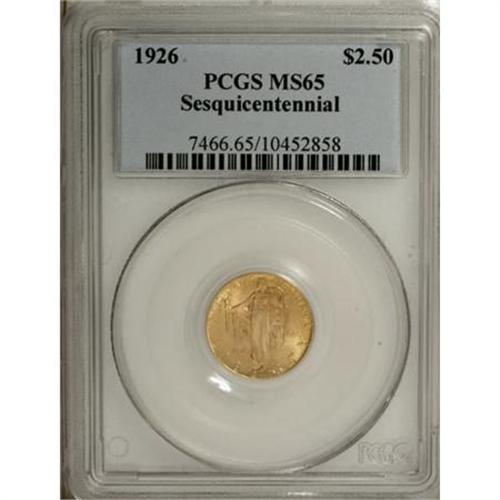 <B>1926 $2 1/2 Sesquicentennial MS65 PCGS.</B></I> Vivacious luster sweeps this well struck and reasonably preserved Sesquicentennial quarter eagle. A well executed strike emboldens the design elements, and both sides yield a beautiful mix of peach-gold and mint-green patina. By coincidence, Indian quarter eagles were also struck at Philadelphia in 1926, for the first time since 1915, which was also the last previous date that quarter eagle commemoratives were struck.<BR><BR><b>Shipping:</b> Coins & Currency (<a target="_blank" href="http://www.heritageauctions.com/common/shipping.php">view shipping information</a>)