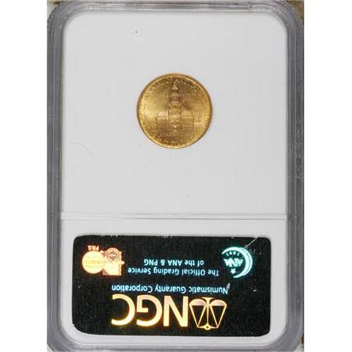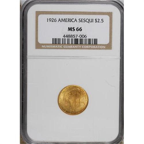 <B>1926 $2 1/2 Sesquicentennial MS66 NGC.</B></I> The Sesquicentennial quarter eagle would prove to be the last gold commemorative issue struck by the United States until 1983. The change in administration from Coolidge to Hoover brought a change in the official attitude toward commemoratives, and Franklin Delano Roosevelt, who approved of commemoratives initially, issued his infamous executive order regarding gold coinage early in his term.<BR> Seasoned commemorative collectors know the difficulty of acquiring a pleasing example of the Sesquicentennial quarter eagle, but this beautiful representative should meet every expectation. The strike is solid, and the gold-orange surfaces offer glittering luster and delicate apricot accents. While the vast majority of examples show grade-limiting marks on Liberty and her torch and scroll, these areas are devoid of mentionable flaws. NGC has graded just three finer examples (7/07).<BR><BR><b>Shipping:</b> Coins & Currency (<a target="_blank" href="http://www.heritageauctions.com/common/shipping.php">view shipping information</a>)