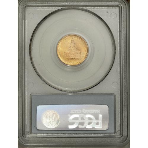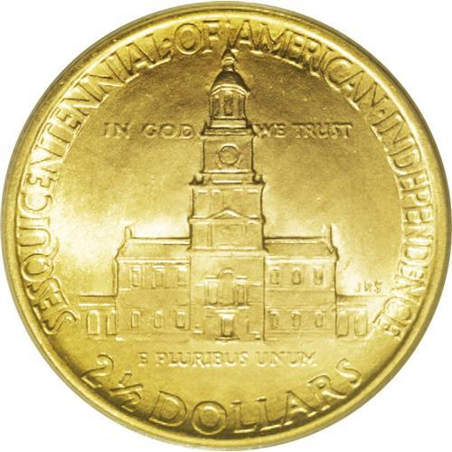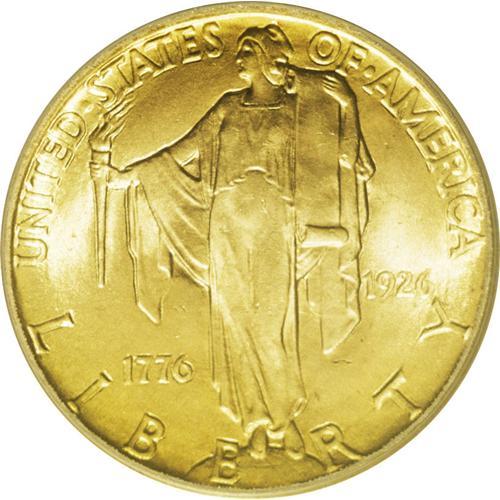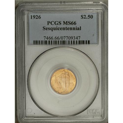 <B>1926<$2 1/2> Sesquicentennial MS66 PCGS.</B></I> The last of the early gold commemoratives, struck to celebrate the sesquicentennial of American Independence, and initially sold as souvenirs at the Sesquicentennial Exposition, in Philadelphia, between June and November of 1926. On the obverse, Liberty holds the Declaration of Independence in one hand and the Torch of Freedom in the other. The reverse features a representation of Independence Hall. This Premium Gem is highly lustrous with deep orange-gold color, and shows only the faintest evidence of coin-to-coin contact, unseen without a magnifier.