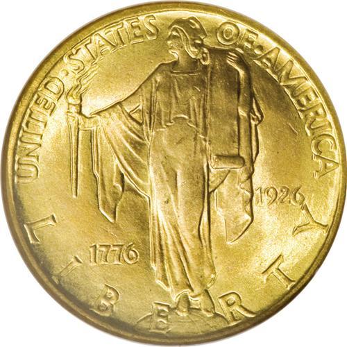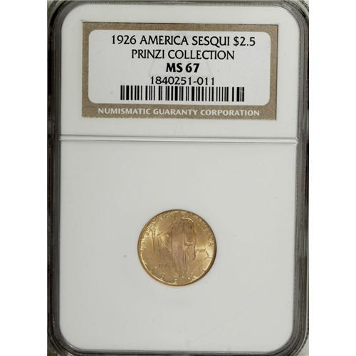 <B>1926 $2 1/2 Sesquicentennial MS67 NGC.</B></I> The National Sesquicentennial Commission, the organization responsible for the Sesquicentennial Exposition, optimistically ordered the full authorized mintage of 1,000,000 half dollars and 200,000 quarter eagles, plus the assay pieces required by law. Like most of the commemorative coin vendors up to that time, the Commission's grandiose dreams floundered on the reefs of reality, and a total of only 45,793 quarter eagles found buyers. The net mintage most often given for this final classic gold commemorative is either the preceding number, the <I>Guide Book</B></I>'s total, 46,019 pieces, or something in between, depending on the ultimate fate of the 226 assay pieces.<BR> As one may derive from the grade, this is a simply exceptional example. The apricot-gold surfaces, laced with peach and emerald, have strong, frosty luster that is a far cry from all but the finest representatives. Liberty's fingers and toes, as well as the building's door and windows, display uncharacteristic, practically pinpoint detail. Only a handful of minuscule marks affect each side, though a small mint-made flaw below the R in AMERICA is noted as a pedigree marker. This is only the fourth Superb Gem of this exceptionally tricky issue ever offered by Heritage. The two most recent pieces were housed in NGC holders, while the earliest was PCGS-graded, though this example likely crossed over to NGC, since no such piece appears in the <I>Population Report.</B></I> Census: 3 in 67, 0 finer (11/06).<BR><I>From The Prinzi Trust Collection.</B></I><BR><BR><b>Shipping:</b> Coin/Currency (<a target="_blank" href="http://www.heritageauctions.com/common/shipping.php">view shipping information</a>)