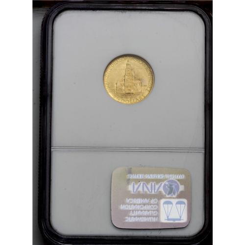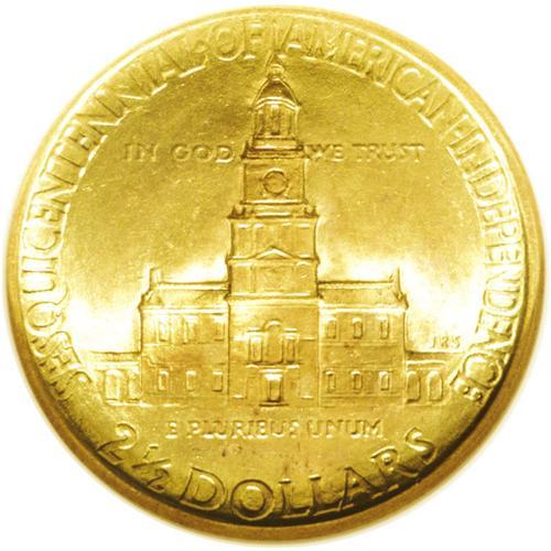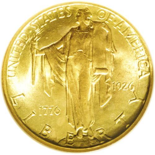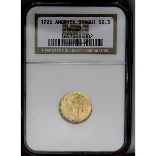 <B>1926<$2 1/2> Sesquicentennial MS67 NGC.</B></I> Congress authorized the 1926 Sesquicentennial commemorative issue to raise funds for a celebratory fair in Philadelphia. The full name of this issue, sometimes simply called the Sesqui, is the Sesquicentennial of American Independence quarter eagle. Both half dollars and quarter eagles were issued, each designed by John R. Sinnock, Chief Engraver of the United States Mint at the time. While the half dollar has conjoined busts of George Washington and Calvin Coolidge, the quarter eagle has a different design. A female with flowing gown stands on top of the world, holding a scroll in one hand and a torch in the other. The scroll is intended to represent the Declaration of Independence while the torch represents freedom. The reverse depicts a front view of Independence Hall in Philadelphia.<BR> This amazing Superb Gem example is tied with two other submissions for the finest of the issue ever certified by NGC. There has never been a similarly graded specimen by PCGS in 20 years of numismatic certification. The 1926 Sesquicentennial quarter eagle was the final commemorative gold issue prior to the modern era of gold commemoratives that began in 1984. Every individual detail is boldly defined on each side. The surfaces have frosty yellow-gold luster with hints of pinkish color. Only with careful examination under magnification can any individual surface marks be discerned. This is a remarkable example with outstanding aesthetic appeal. Census: 3 in 67, 0 finer (6/06).<BR><I>From The Belle Glade Collection.</B></I>