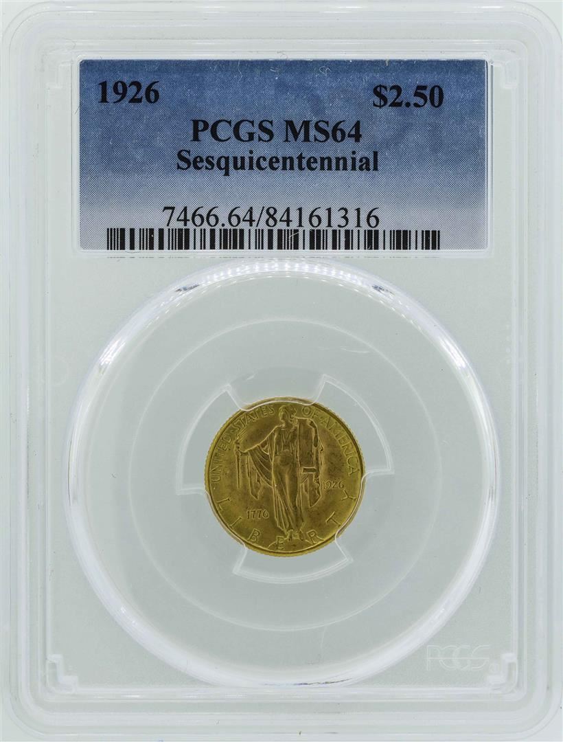 One 1926 $2 1/2 Sesquicentennial Quarter Eagle Commemorative Gold Coin PCGS MS64. PCGS Graded.