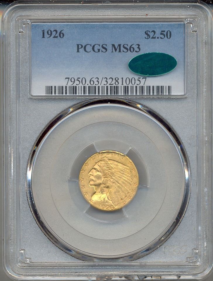 One 1926 $2.5 Indian Head Quarter Eagle Gold Coin PCGS MS63 CAC.
