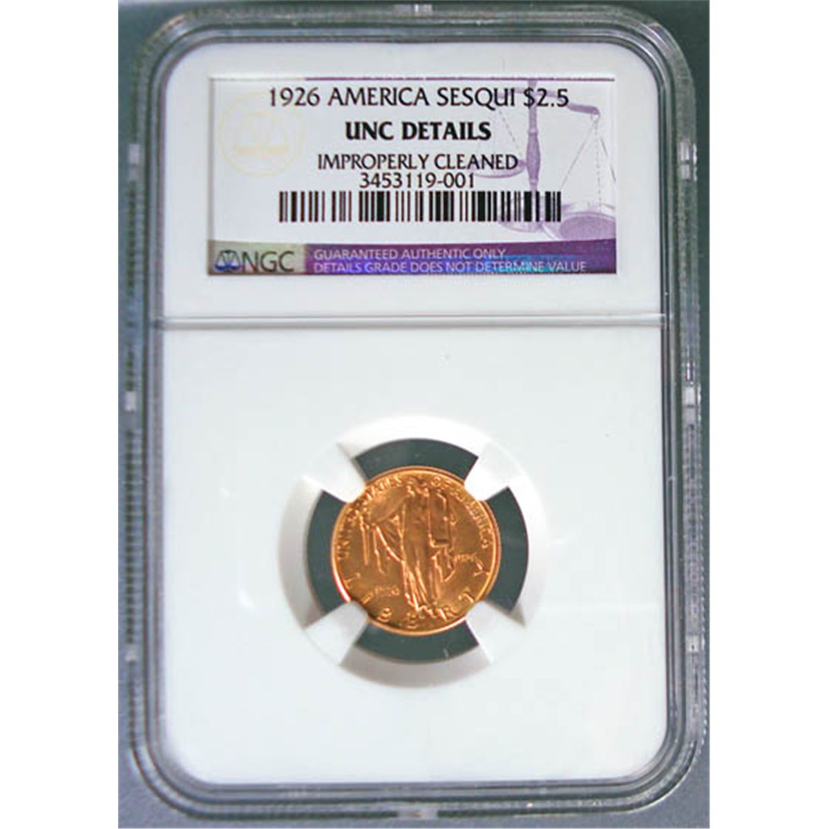 1926 $2.50 AMERICA SESQUI. GOLD, NGC UNC. CLEANED