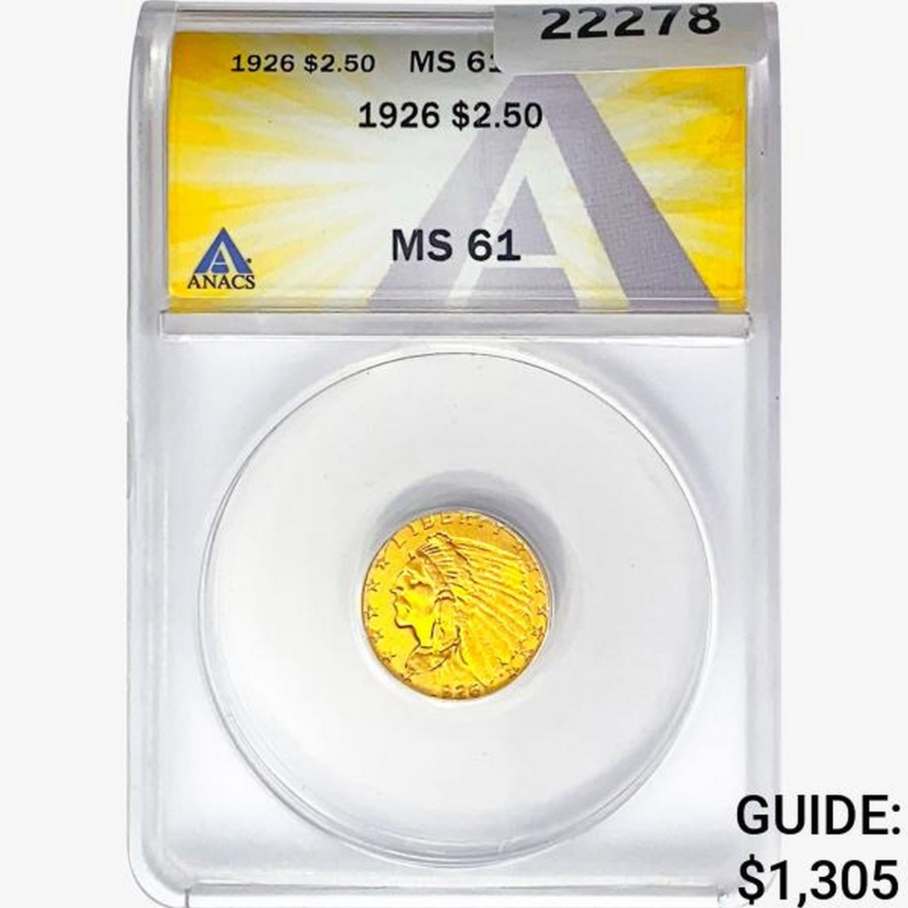 1926 $2.50 Gold Quarter Eagle ANACS MS61