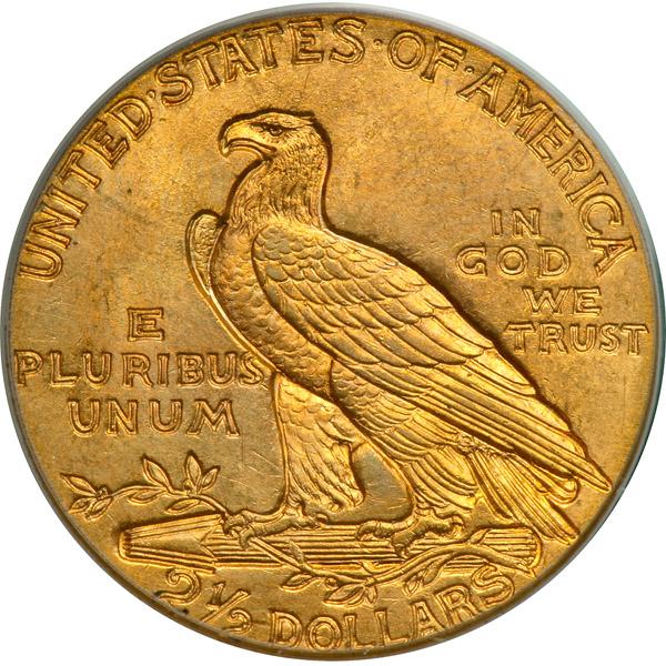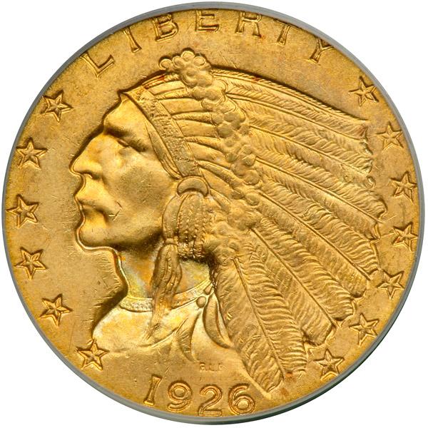 1926 $2.50 Indian. PCGS graded MS-65. Well struck with even rich golden toning on both sides. A lovely gem specimen. Almost always razor sharp. The fully brilliant gem we now hand over bidders beats (from a technical angle) practically all of the MS65s that have passed through the various grading services. Unlike the usual survivor from the 'teens with its diminished impression left by a weak blow of the dies on some of the headdress feathers, this handsome 1926 specimen struck during America's Roaring Twenties is very sharp from top to bottom, center to edge (PCGS # 7950) .
