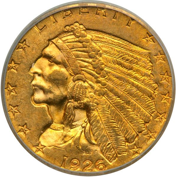 1926 $2.50 Indian. ICG graded MS-63. Attractive golden toning.