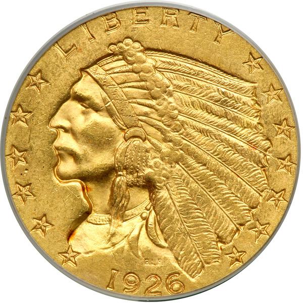1926 $2.50 Indian. PCGS graded MS-62. Frosty and lightly toned; popular Indian head Type (PCGS # 7950) .