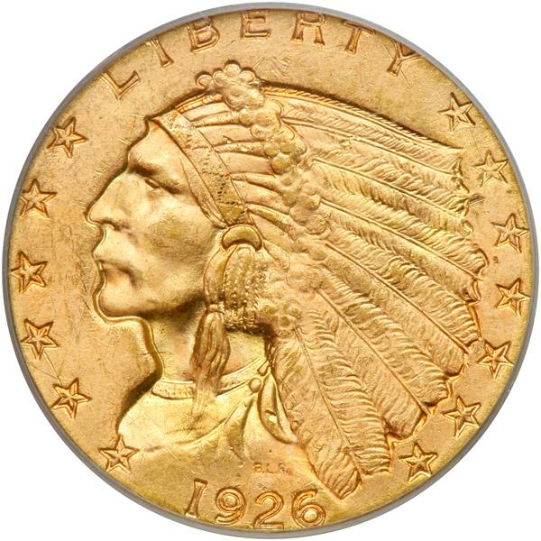 1926. PCGS graded MS-64. Frosty with full mint bloom colors. Desirable for the Denver Mintmark. There were no quarter eagles issued in the years 1916-24 (PCGS # 7950) .