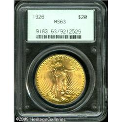 <B>1926 $20 MS63 PCGS.</B></I> Satiny light yellow-gold with wisps of pink color. A pleasing example. Lot:9709