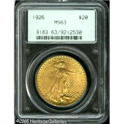 <B>1926 $20 MS63 PCGS.</B></I> Sharply struck and fully lustrous with brilliant pinkish yellow-gold surfaces. Lot:9710