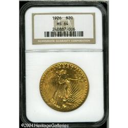 1926 $20 MS64 NGC. Bright peach-gold patina and vi <B>1926 $20 MS64 NGC.</B></I> Bright peach-gold patina and vibrant luster affirm the eye appeal of this carefully preserved Saint-Gaudens. The date and nearby rays and stars are perceptibly die doubled. <BR><BR><B>Important notice:</B> Heritage usually auctions material at the rate of 200-250 lots per hour. On some occasions eBay Live bid software or the Internet may not be able to keep up with the pace of the auction. We recommend placing a realistic absentee bid now as insurance to avoid disappointment. Occasionally the auctioneer may eliminate or reject an eBay Live bid, and the auctioneer may also reopen a lot after the close of the eBay live bidding (usually because we missed an audience bid), and may reject your bid even if it shows you as the winning bidder. By bidding via eBay Live, you agree that Heritage may award the lot to another bidder at its sole discretion under the circumstances described above or any other reasonable circumstances. Since eBay bids are not shown to us until we open the lot on the floor, we treat those bids just like floor bids. In most cases the floor responds before the eBay bid is presented to us, due to Internet lag time, so for consistency we have made it a policy that floor bids are always considered first over tie eBay live bids. Also please note that all Heritage lots purchased through eBay Live carry a 20% Buyer's Premium. Please make sure you read the Terms and Conditions before you bid. This lot is being auctioned in conjunction with a live floor auction by Heritage Galleries & Auctioneers. All final auction and invoice information will be supplied by Heritage Galleries & Auctioneers, and all other information should be considered preliminary. Lot:7237