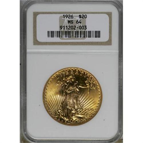 <B>1926 $20 MS64 NGC.</B></I> NGC Census: (7780/3081). PCGS Population (5623/3814). Mintage: 816,750. Numismedia Wsl. Price for NGC/PCGS coin in MS64: $1,210. (#9183)<BR><BR><B>Coin Engraver:</B> Augustus Saint-Gaudens<BR><BR><b>Shipping:</b> Coins & Currency (<a target="_blank" href="http://www.heritageauctions.com/common/shipping.php">view shipping information</a>)