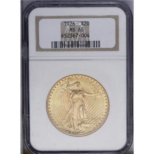 <B>1926<$20> MS65 NGC.</B></I> A gorgeous Gem with shimmering, smooth surfaces and alternating orange and lime tones. Crisply struck, and limited in grade by only a small mark on the raised knee. <BR><BR><B>Important notice:</B> Heritage usually auctions material at the rate of 200-250 lots per hour. On some occasions eBay Live bid software or the Internet may not be able to keep up with the pace of the auction. We recommend placing a realistic absentee bid now as insurance to avoid disappointment. Occasionally the auctioneer may eliminate or reject an eBay Live bid, and the auctioneer may also reopen a lot after the close of the eBay live bidding (usually because we missed an audience bid), and may reject your bid even if it shows you as the winning bidder. By bidding via eBay Live, you agree that Heritage may award the lot to another bidder at its sole discretion under the circumstances described above or any other reasonable circumstances. Since eBay bids are not shown to us until we open the lot on the floor, we treat those bids just like floor bids. In most cases the floor responds before the eBay bid is presented to us, due to Internet lag time, so for consistency we have made it a policy that floor bids are always considered first over tie eBay live bids. Also please note that all Heritage lots purchased through eBay Live carry a 20% Buyer's Premium. Please make sure you read the Terms and Conditions before you bid. This lot is being auctioned in conjunction with a live floor auction by Heritage Galleries & Auctioneers. All final auction and invoice information will be supplied by Heritage Galleries & Auctioneers, and all other information should be considered preliminary. Lot:4730 <BR><BR><B>Winning Notification and Billing:</B> After the FINAL session in this auction is complete, Heritage will send e-mail and snail mail invoices. This process normally takes several days. All final auction and invoice information will be supplied by Heritage Galleries & Auctioneers, and all other information should be considered preliminary. <BR><BR>This auction will be conducted on a live auction floor and over the Internet through eBay Live. If you choose to place an absentee bid, please take a moment to <font color='#0000ff'><u><a href='http://pages.ebay.com/liveauctions/help/before/laabsentee.html'>learn how eBay Live absentee bidding works</a></u></font><font color='#000000'>