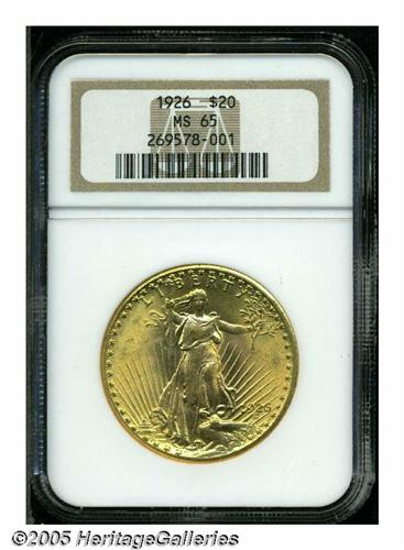 <B>1926<$20> MS65 NGC.</B></I> Well struck and richly lustrous, with matte-like surfaces that are beautifully toned in pink-gold and yellow-green colors. There are a few trivial contact marks near the center of each side, but they fail to call the Gem grade assessment into question. A lovely example of the artful Saint-Gaudens design.