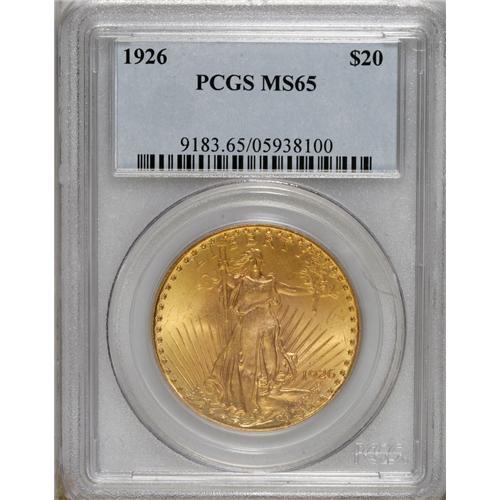 <B>1926 $20 MS65 PCGS.</B></I> Large numbers of the 1926 double eagles were saved in European banks and have subsequently made their way back home, making this a relatively common issue. Orange-gold luster displays tints of light tan, and a sharp strike emboldens the design elements. A few grade-consistent marks do not disturb.<BR><BR><b>Shipping:</b> Coins & Currency (<a target="_blank" href="http://www.heritageauctions.com/common/shipping.php">view shipping information</a>)