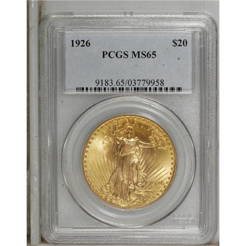 <B>1926 $20 MS65 PCGS.</B></I> The 1926 is one of the most common dates of the Saint-Gaudens double eagle series, as a large number were saved in European banks, and have since returned to the States. This lot presents a beautiful apricot-gold specimen with dazzling luster and a solid strike. A few inoffensive obverse marks likely have prevented an even higher grade designation.<BR><BR><b>Shipping:</b> Coins & Currency (<a target="_blank" href="http://www.heritageauctions.com/common/shipping.php">view shipping information</a>)