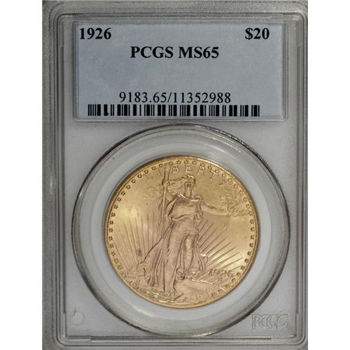 <B>1926 $20 MS65 PCGS.</B></I> The vibrant apricot-gold surfaces have a hint of frostiness, particularly on the obverse. Well-defined with a handful of light marks that do not jeopardize the grade.<BR><BR><b>Shipping:</b> Coins & Currency (<a target="_blank" href="http://www.heritageauctions.com/common/shipping.php">view shipping information</a>)