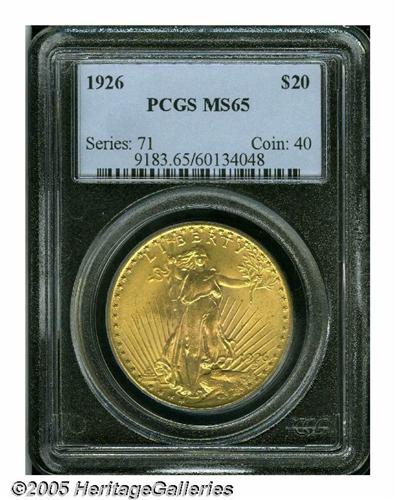 <B>1926<$20> MS65 PCGS.</B></I> Well struck Gem example with very attractive surfaces, good luster and a few light, scattered marks.