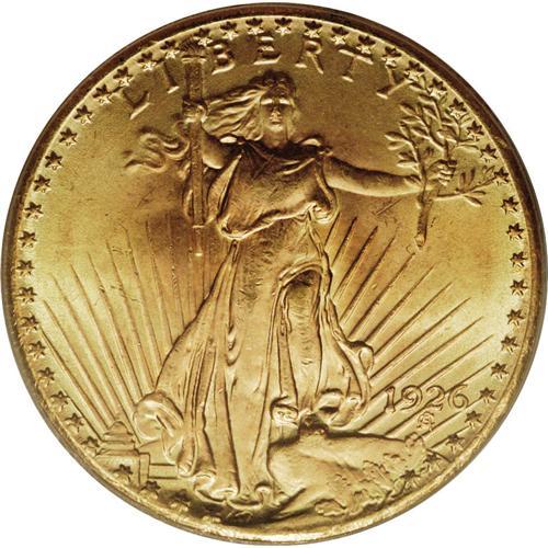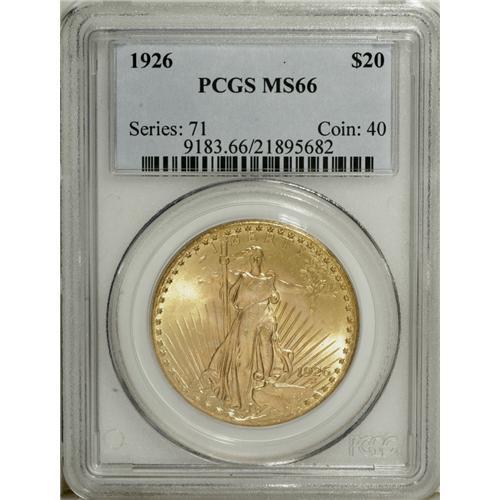 <B>1926 $20 MS66 PCGS.</B></I> A significant number of 1926-P double eagles were saved in European banks, making this date one of the most common issues in the Saint-Gaudens twenty dollar series. Thousands of coins have been certified by PCGS and NGC through the MS65 grade level. The 1926 becomes somewhat more challenging in MS66, and is extremely rare any finer. Greenish-gold luster radiates from lovingly preserved surfaces, and a well-executed strike emboldens the design elements.<BR><I>From The Kutasi Collection.</B></I><BR><BR><b>Shipping:</b> Coin/Currency (<a target="_blank" href="http://www.heritageauctions.com/common/shipping.php">view shipping information</a>)