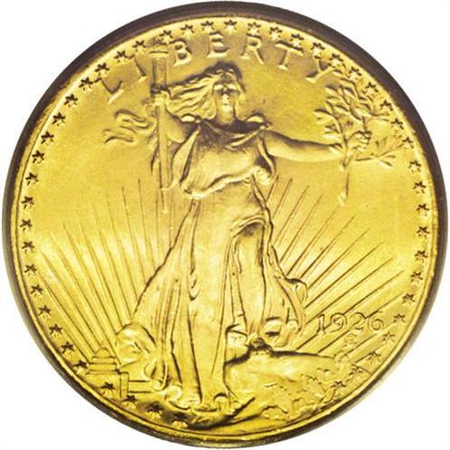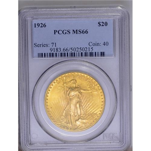 <B>1926<$20> MS66 PCGS.</B></I> A vibrant example of what a Double Eagle should look like, with pleasant satiny fields shimmering with lemon centers and bold golden color elsewhere. The devices are well struck displaying sharp detail, and, as expected of the grade, there are no singularly mentionable marks.